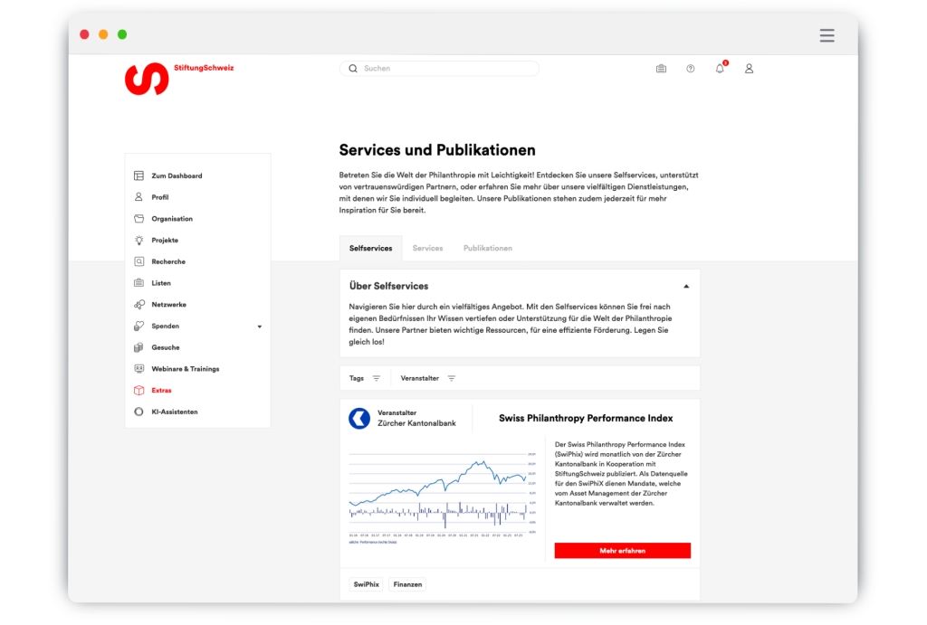 Durchstöbern Sie hier unser vielfältiges Angebot. Mit den Selfservices können Sie Ihr Wissen nach Ihren eigenen Bedürfnissen vertiefen oder Unterstützung für die Welt der Philanthropie finden: Entdecken Sie den Branchenreport mit spannenden Zahlen und Statistiken, den Spheriq-Blog mit wertvollen Ratgeberinhalten oder lesen das Online-Magazin von ThePhilanthropist. Unsere Partner stellen zudem spannende Dienste wie die Stiftungsratssuche oder den Swiss Philanthropy Performance Index zur Verfügung. Legen Sie jetzt gleich los!