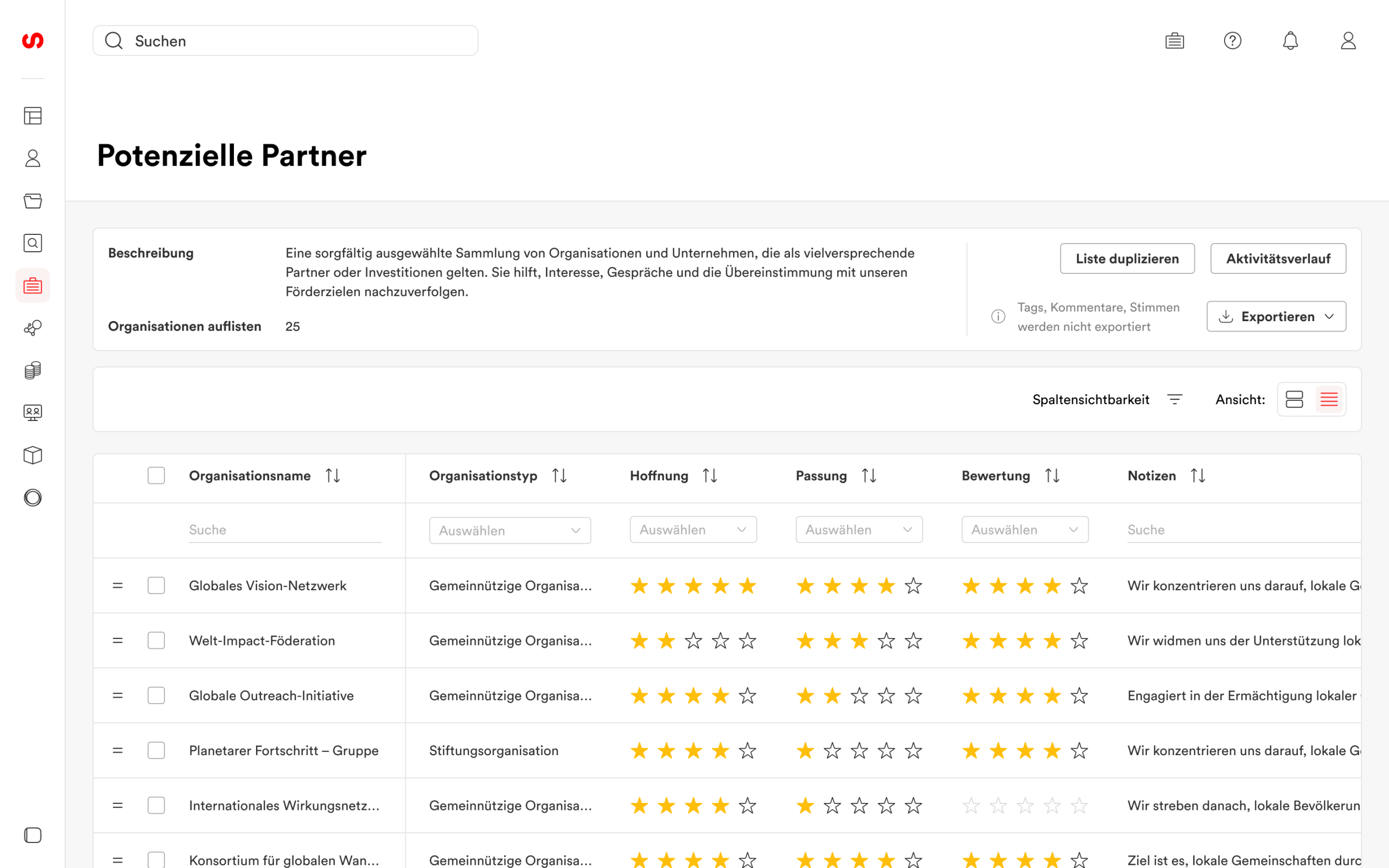 Mit der Listen-Funktion behalten Sie den Überblick über relevante Förderpartner. Bewerten und kommentieren Sie Ihre Rechercheergebnisse – und exportieren Sie die Daten bei Bedarf in verschiedenen Formaten. Dank der gemeinsamen Bearbeitung bleiben Sie und Ihr Team jederzeit auf dem gleichen Stand und erhalten zudem automatische Empfehlungen für weitere passende Stiftungen.
