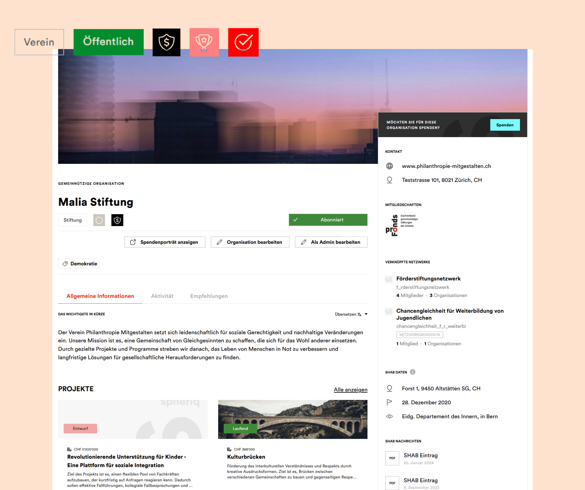 Nutzen Sie die Reichweite der grössten Schweizer Philanthropieplattform, um Ihre Nonprofit-Organisation ins Rampenlicht zu rücken. Erstellen Sie aussagekräftige Organisations- und Projektprofile. So können Sie Allianzen schliessen, Ihr Anliegen bekannter machen und sich mit anderen Akteur:innen im gemeinnützigen Sektor austauschen.