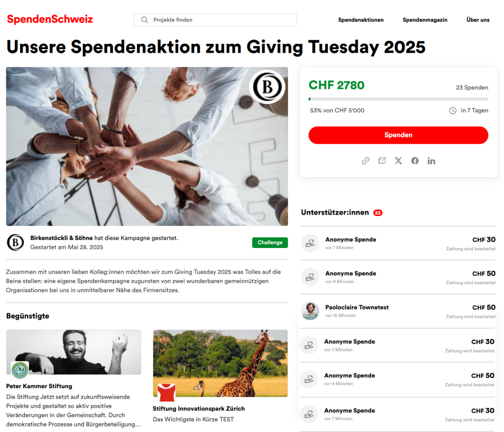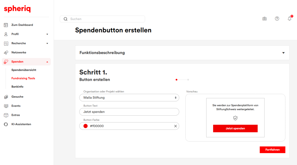 Der Kampagnengenerator ermöglicht es Privatspender:innen, mit wenigen Klicks massgeschneiderte Spendenaktionen zu erstellen. Mit einem Spheriq-Zugang kann Ihre Organisation und Ihre Projekte ausgewählt werden und erreicht so noch mehr Sichtbarkeit.