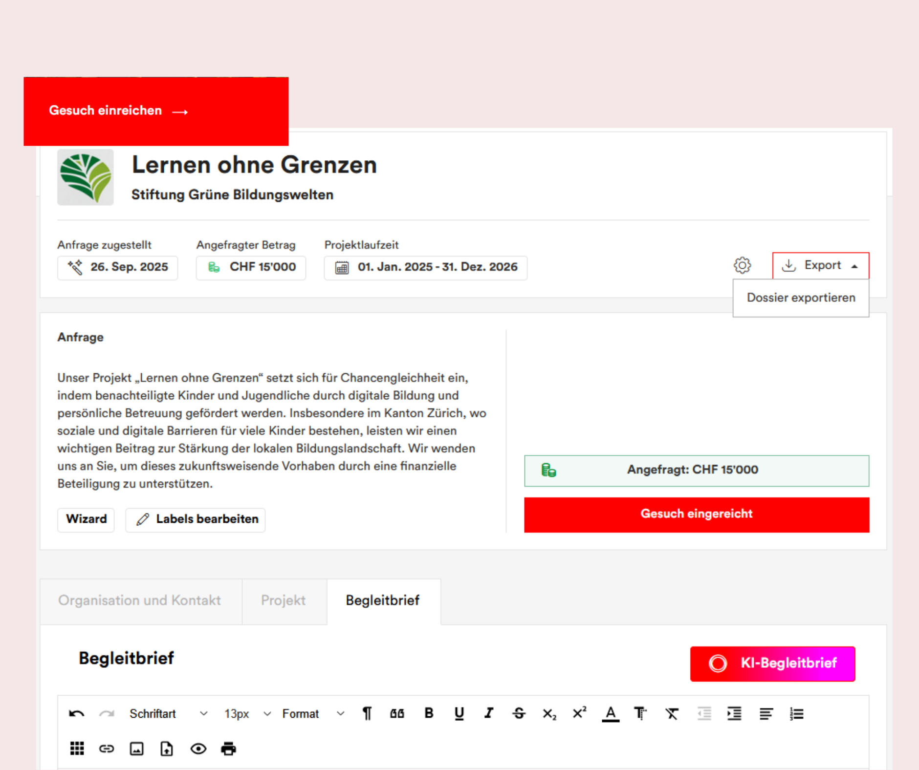 Mit wenigen Klicks starten Sie den Begleitbriefgenerator, der ein überzeugendes Anschreiben an ausgewählte Förderorganisationen für Sie verfasst. Wählen Sie Projekt, Sprache und Förderorganisation und ergänzen Sie Zusatzinformationen – in kürzester Zeit erhalten Sie einen fertigen Brief, den Sie ausdrucken und direkt für Ihre Gesuchstellung verwenden können.