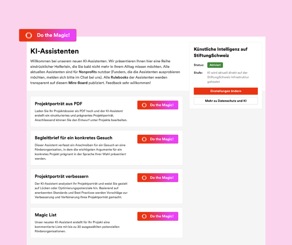 Die Magic List erstellt eine Liste mit bis zu 30 potenziellen Förderorganisationen. Jede Organisation wird nach ihrer Relevanz für Ihr Projekt bewertet – so sparen Sie wertvolle Zeit bei der Suche nach passenden Stiftungen.