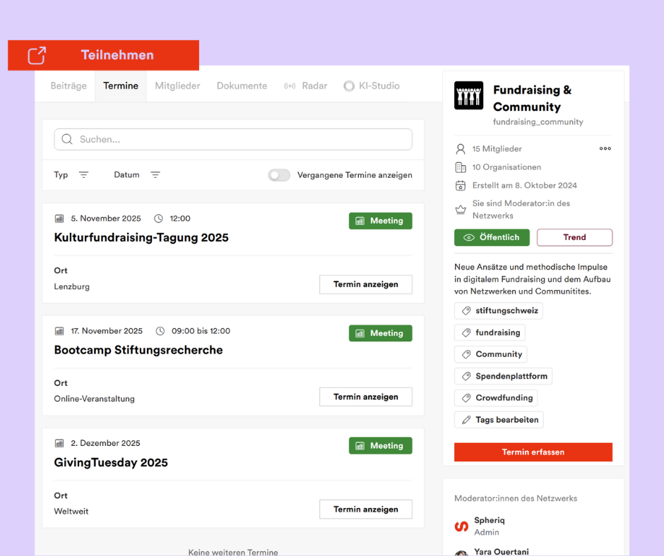 Treten Sie themenrelevanten Trendnetzwerken bei oder gründen Sie eigene Communities, um sich mit potenziellen Förderpartnern und anderen Nonprofits zu vernetzen. Tauschen Sie Wissen, Erfahrungen und Ideen aus, um gemeinsam den grösstmöglichen Impact zu erzielen.