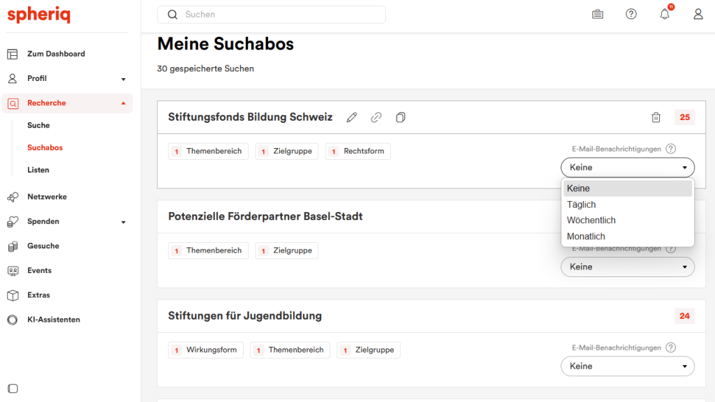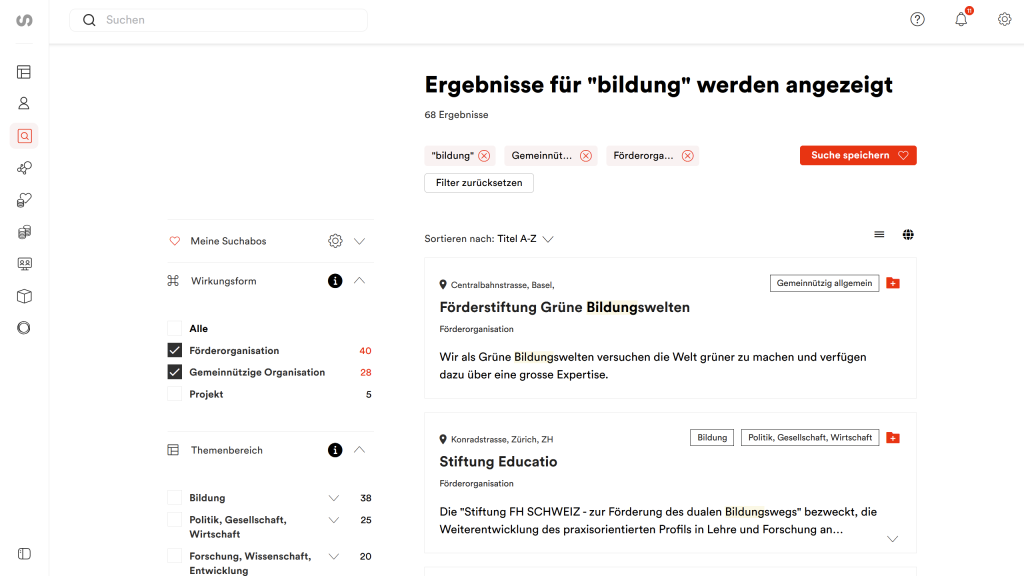Sie möchten als Nonprofit-Organisation neue Fördermittel erschliessen? Mit den Recherche-Tools von Spheriq entdecken Sie unter über 15000 Organisationen schnell und zielsicher potenzielle Partner. Dank intelligenter Filter gelangen Sie im Handumdrehen zu passenden Resultaten. Ihre Ergebnisse verwalten und bewerten Sie in übersichtlichen Listen – allein oder gemeinsam mit Ihrem Team.
