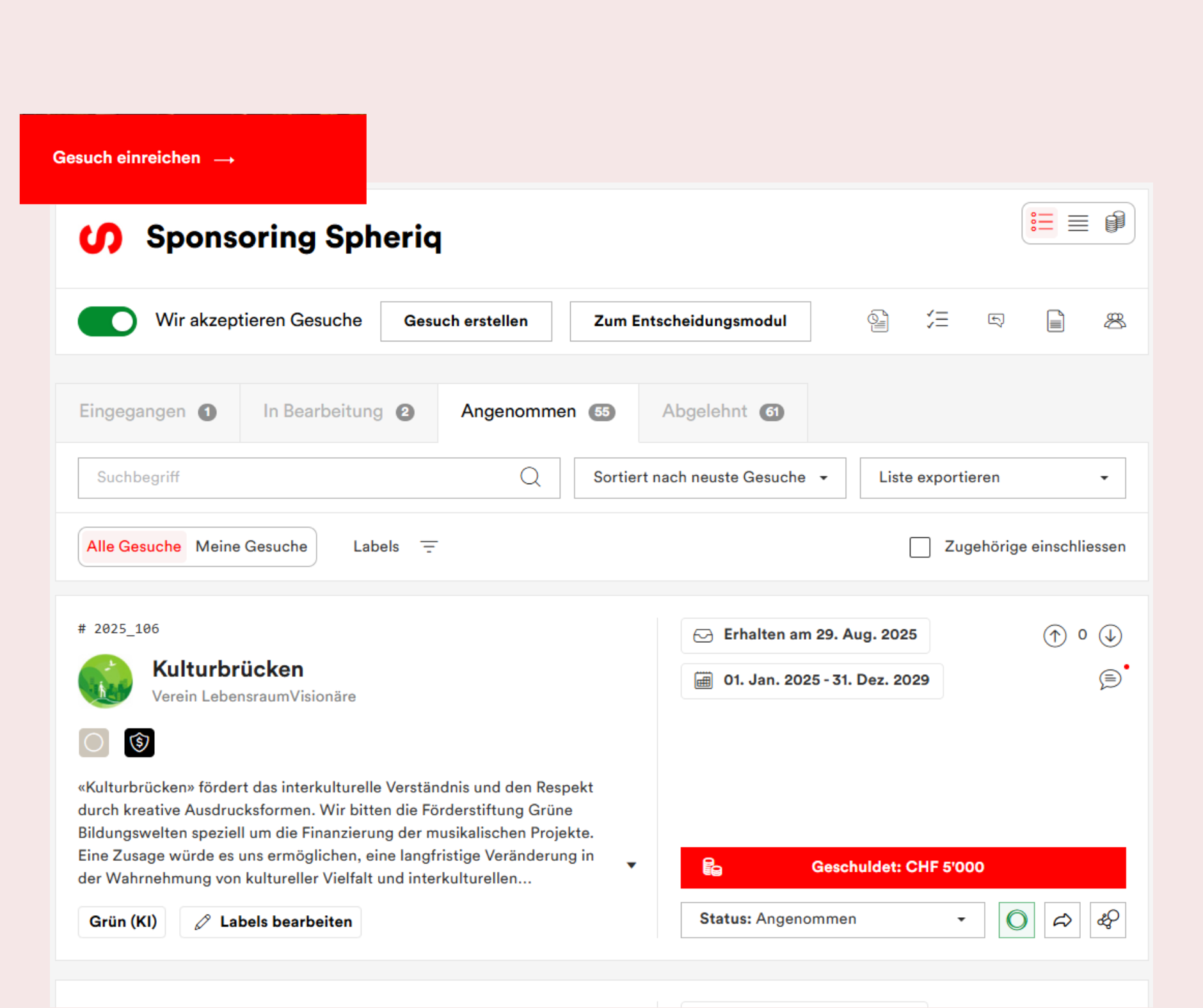 Mit Spheriq managen Sie den gesamten Prozess Ihrer Sponsoringaktivitäten von der Anfrage bis zur Entscheidung. Ob Anfragen von lokalen Sportvereinen, nicht-gemeinnützigen Organisationen oder Einzelpersonen: Die digitale Lösung vereinfacht den Empfang und die Bearbeitung unterschiedlichster Gesuche und hilft Ihnen, Ihre internen Ressourcen gezielt einzusetzen.