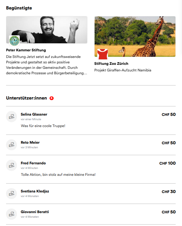 Jede Kampagne kann visuell und inhaltlich an Ihre Unternehmensidentität angepasst werden. Bei Veranstaltungen oder Firmenanlässen können Spenden direkt vor Ort gesammelt werden, beispielsweise mit einem QR-Code: Die Teilnehmenden gelangen in einem Klick auf Ihre Aktionsseite, wo sie unkompliziert und digital spenden können.