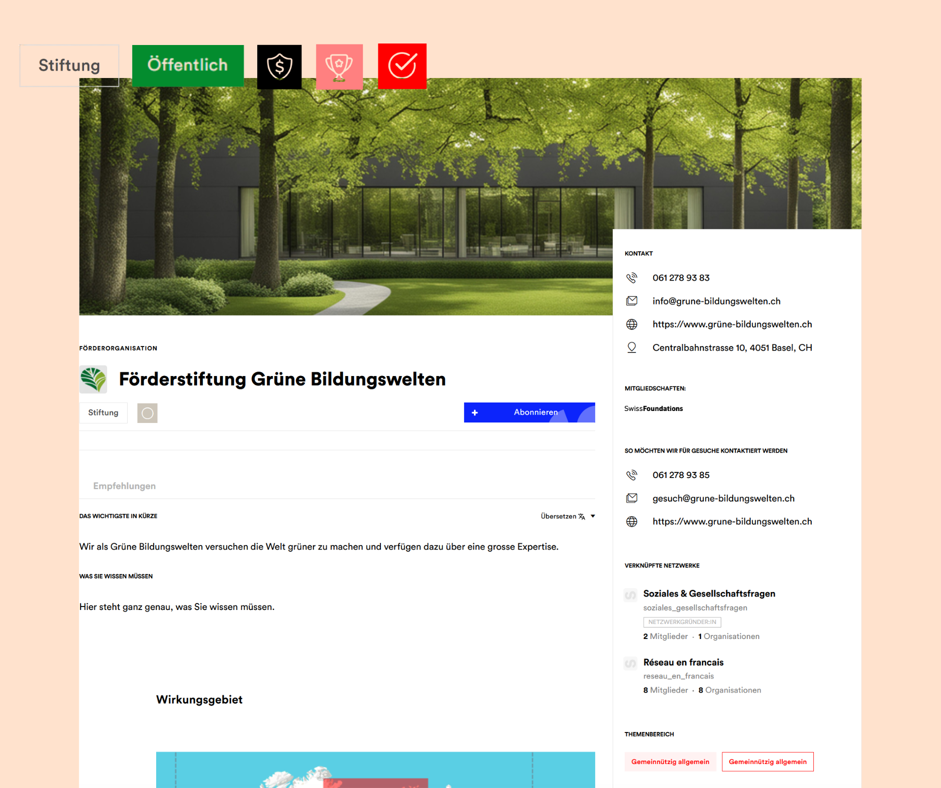 Setzen Sie ein Zeichen der Transparenz und Professionalität. Mit Abzeichen wie «Verwaltet», «Ergänzt» oder «Steuerbefreit» zeigen Sie auf einen Blick, dass Ihr Profil aktuell, vollständig und überprüft ist. Andere Badges wie «Vernetzt» oder «Champion» zeichnen besonders aktive und kooperative Organisationen aus – und erhöhen Ihre Sichtbarkeit auf der Plattform