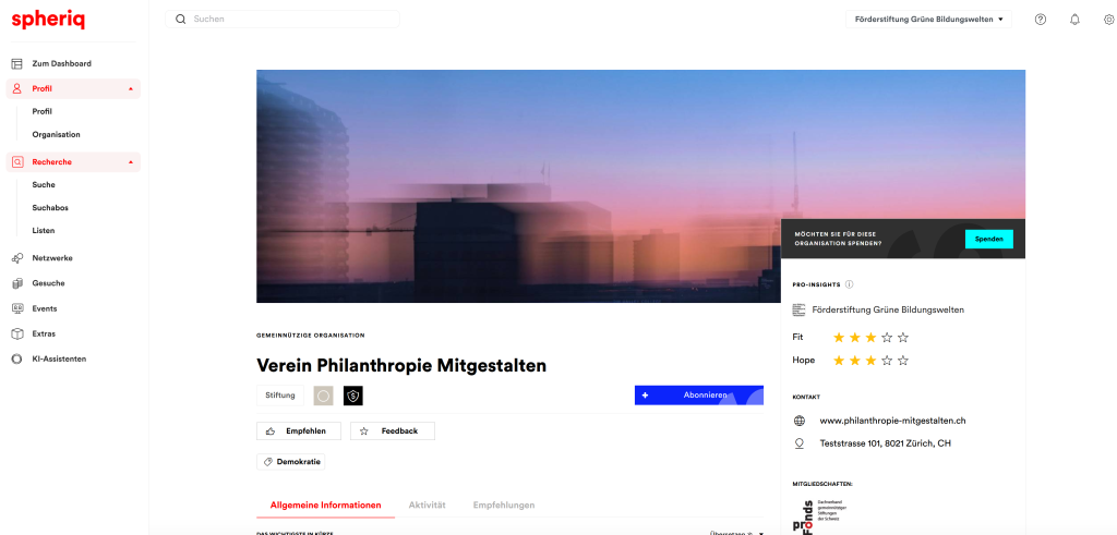 Die Organisations- und Projektprofile auf Spheriq enthalten strukturierte Informationen, die Sie bei der eigenen Due Diligence unterstützen. Mit „Fit & Hope“ sehen Sie auf einen Blick, ob sich ein vertieftes Studium lohnt. Die Förderchronik zeigt Ihnen, wer eine Organisation oder ein Projekt in der Vergangenheit unterstützt hat. Eine allfällige Steuerbefreiung von Spheriq überprüft und auf dem Profil angezeigt. Auch Empfehlungen anderer Funder unterstützen Sie in Ihrer eigenen Beurteilung.