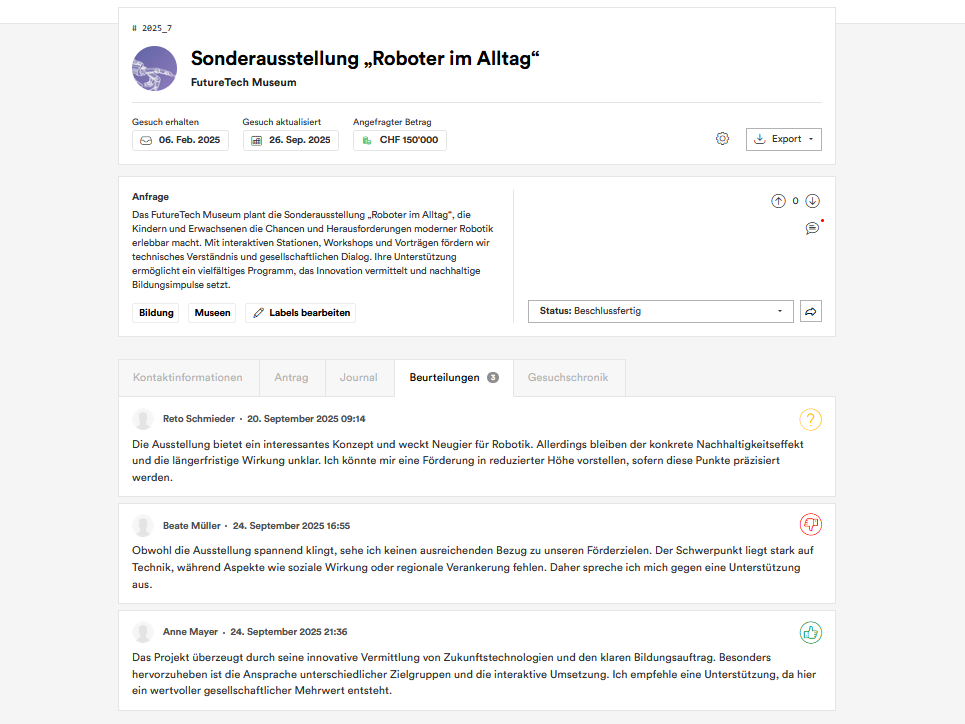 Mit dem Gesuchs- und Fördermanagement von Spheriq strukturieren Sie Ihren gesamten Förderprozess: von der Online-Gesuchseinreichung über die Beurteilung bis zur Entscheidungsfindung. So behalten Sie den Überblick – und schaffen mehr Raum für strategische Förderung.