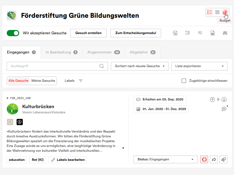 Behalten Sie alle eingegangenen Anträge im Blick, organisieren Sie Fristen und Budgets und dokumentieren Sie Entscheidungen an einem Ort. So machen Sie Ihr Fördermanagement transparent und nachvollziehbar.