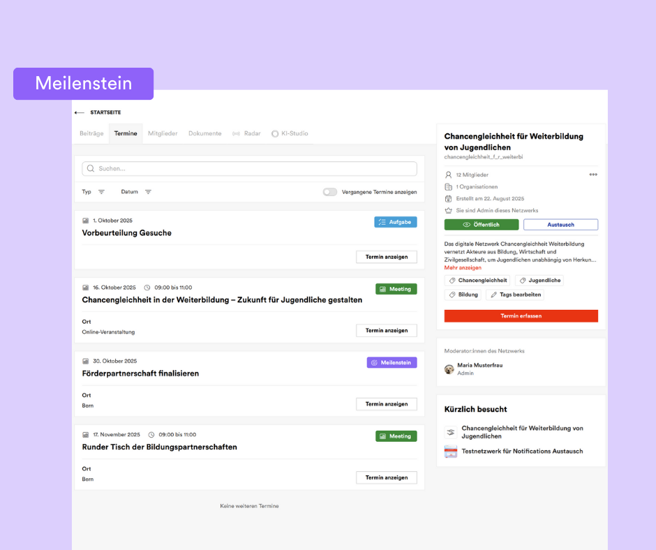 In einem Netzwerk können Sie Sitzungen, Aufgaben und Traktanden zentral an einem Ort planen und verwalten – inklusive Terminübersicht, Kalendersynchronisation und integriertem Link für Videocalls. Spezifische Workspaces gestalten Sie entlang von Projekten, Gremien oder Themenschwerpunkten – zum Beispiel für die Geschäftstelle oder den Stiftungsrat. So koordinieren Sie Ihre Zusammenarbeit in Stiftungsräten, Teams und interdisziplinären Arbeitsgruppen mit klaren Rollen, Beiträgen und sauber geregelten Zugriffsrechten. Der optionale KI-Assistent hilft Ihnen bei Zusammenfassungen von Dossiers und beim Verfassen von Empfehlungen, damit Sie Ihre Gremienarbeit jederzeit ortsunabhängig und effizient tätigen können.