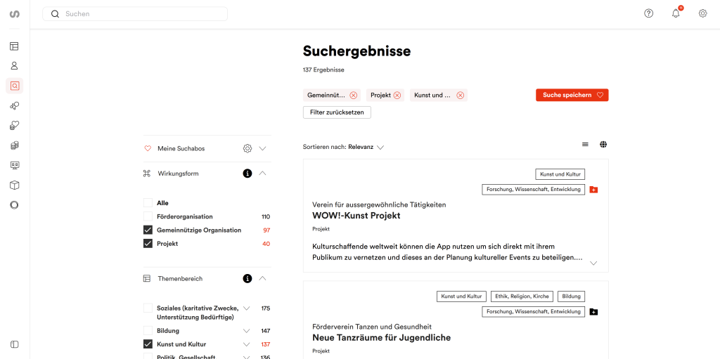 Finden Sie gezielt Organisationen und Initiativen, die Ihren Förderschwerpunkten entsprechen. Nutzen Sie umfangreiche Filterfunktionen, speichern Sie Ihre Suchanfragen und erhalten Sie automatische Updates zu neuen, relevanten Einträgen.