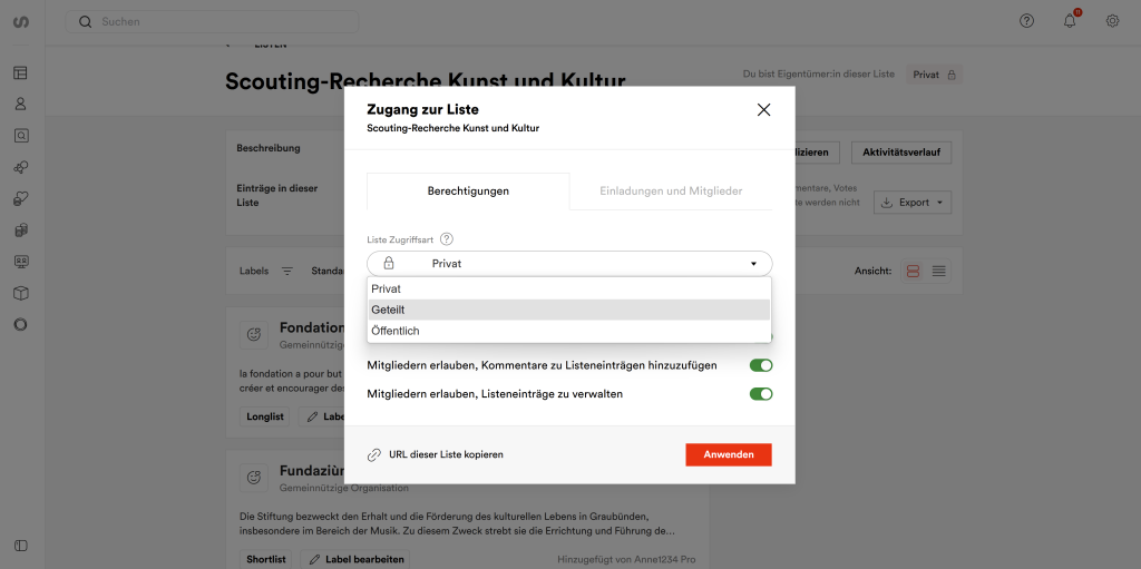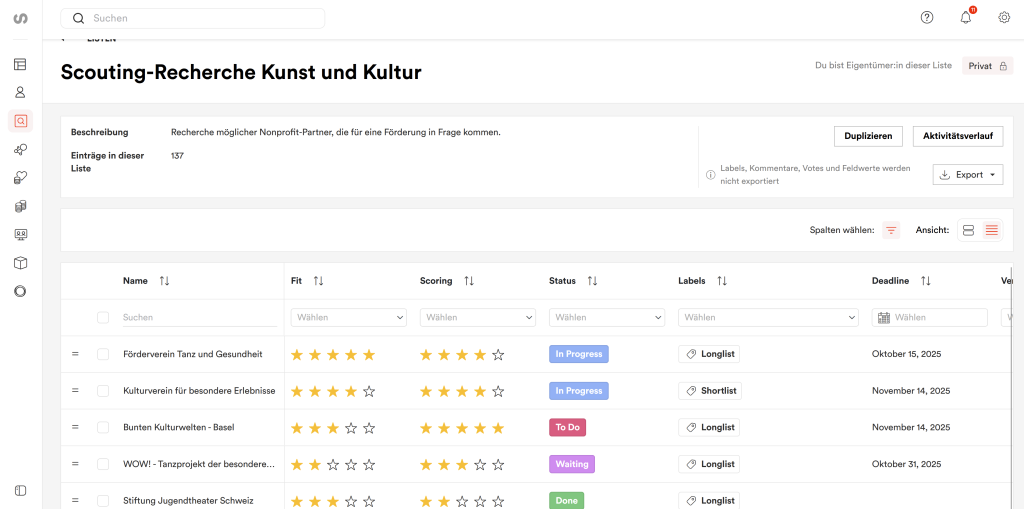 Arbeiten Sie mit gleichgesinnten Stiftungen zusammen: Teilen Sie Recherchelisten, koordinieren Sie Förderentscheide und laden Sie gemeinsam Organisationen zur Gesuchstellung ein.