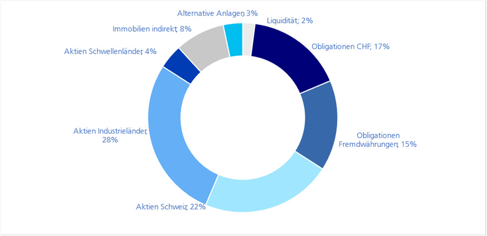 Die Performance in einem Monat hängt von den Entwicklungen in den einzelnen Anlagekategorien ab. Die nachstehende Grafik zeigt die aktuelle mittlere Allokation über die verschiedenen Anlagekategorien.